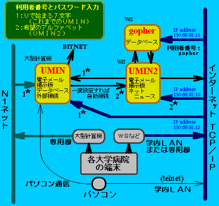 TCP/IP接続大学(94年7月現在)…東京医科歯科大学、東京大学、 福井医科大学、山梨医科大学、滋賀医科大学、熊本大学
